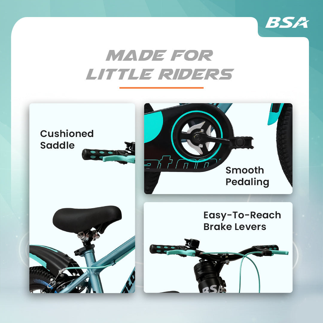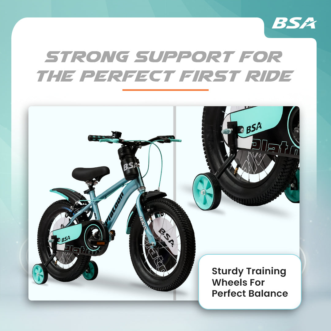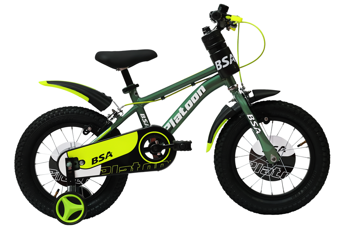 The BSA Platoon Kids Cycle is the perfect blend of style, comfort, and safety for young riders. Designed with a sporty, dynamic look, this bike is sure to catch the attention of any young adventurer. Featuring vibrant colors and a sleek frame, it offers a fun and exciting ride for kids. Equipped with sturdy training wheels, the BSA Platoon ensures stability and support while your child builds confidence and skills on two wheels. Ideal for beginners, it combines smooth handling with a durable build, making it perfect for outdoor play and active exploration. Whether cruising around the park or learning new tricks, the BSA Platoon is ready to take your child on their next adventure!