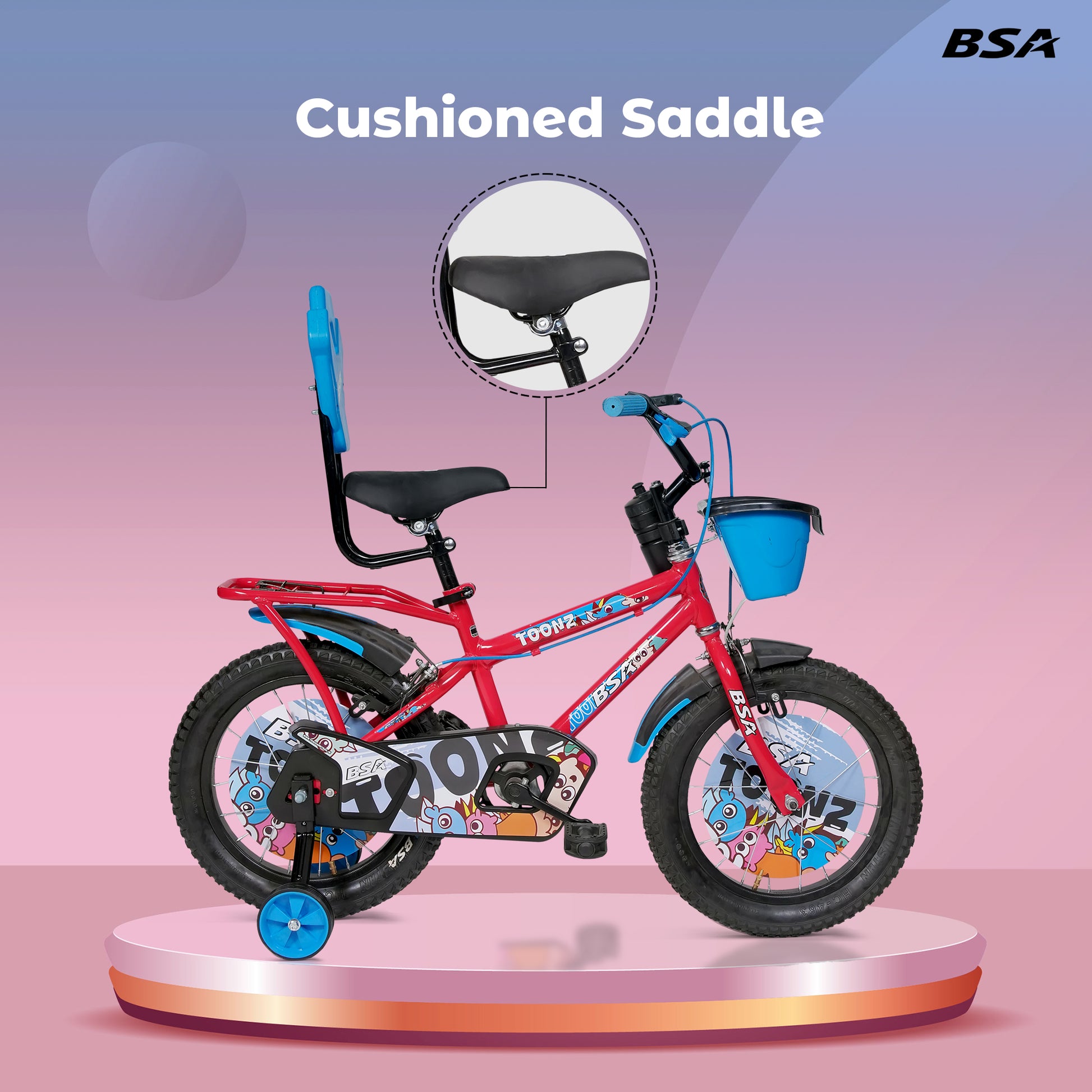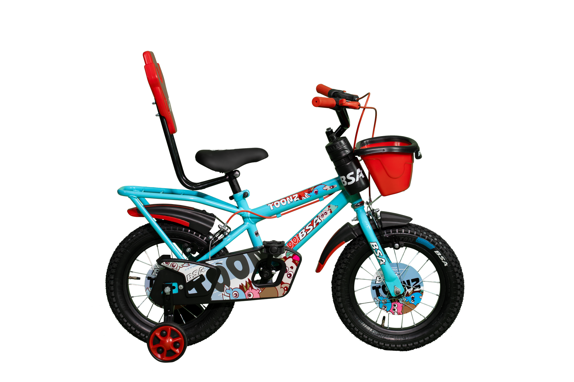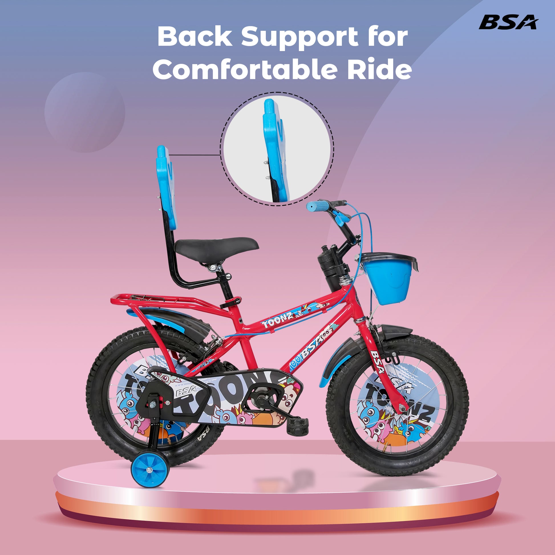 The BSA Toonz Kids Cycle is the ultimate choice for young riders, combining comfort, safety, and fun. Designed with bright, playful colors and a kid-friendly frame, this bike offers a delightful ride for little adventurers. The included back support ensures added comfort and safety, giving parents peace of mind while their children ride. Equipped with sturdy training wheels, the BSA Toonz helps build confidence and balance, making it perfect for beginners. Whether it's their first ride or they're improving their skills, the BSA Toonz provides a smooth, stable, and enjoyable cycling experience for every young rider. Let your child explore the outdoors in style with this reliable, fun-filled cycle!