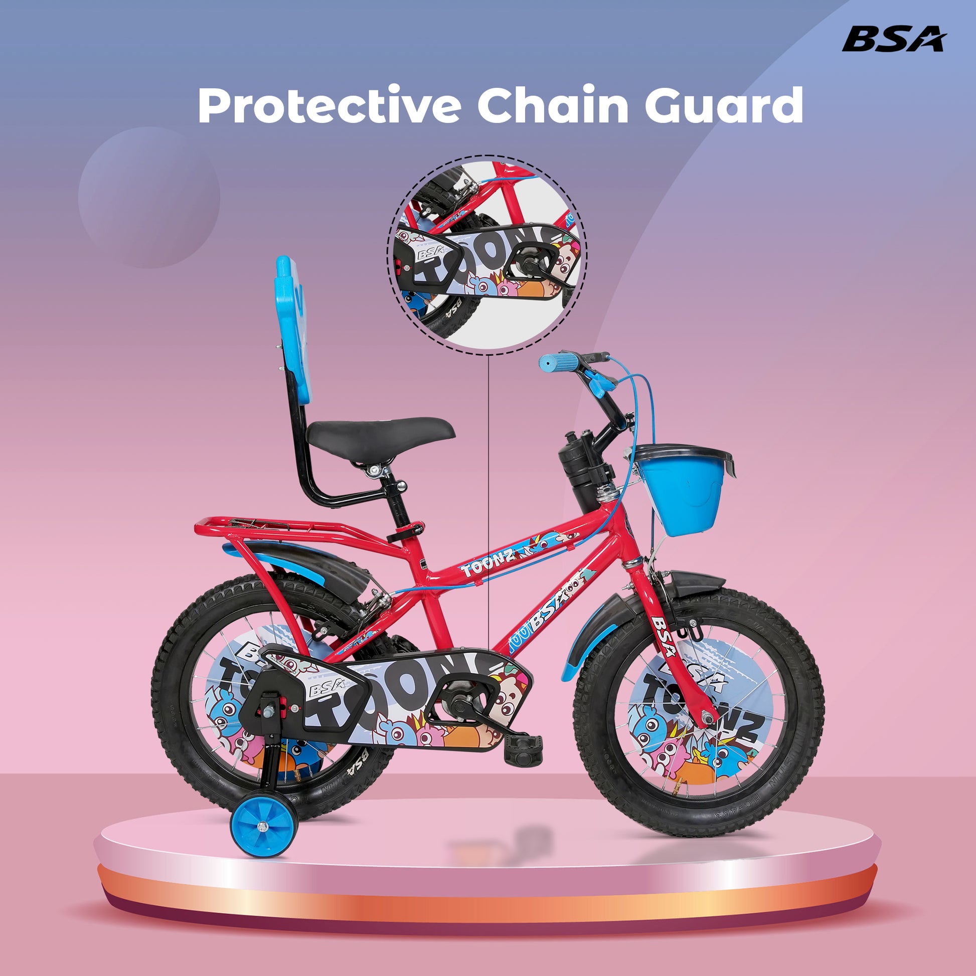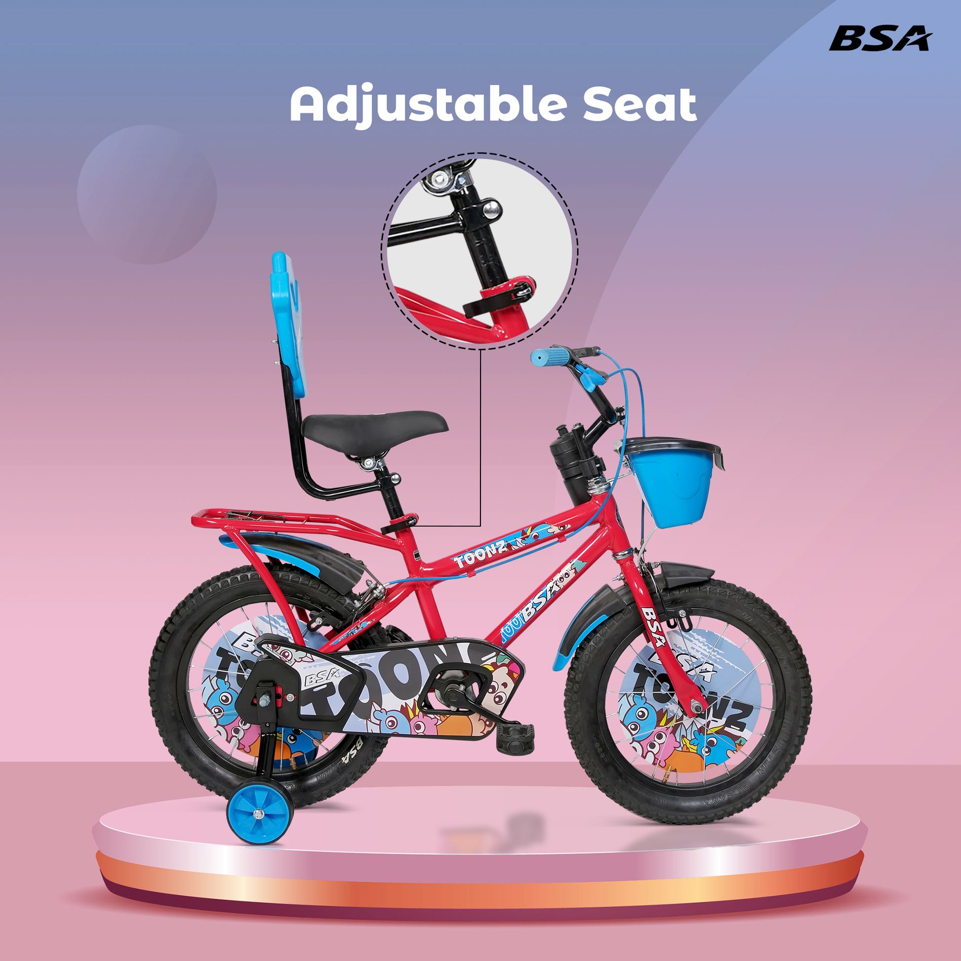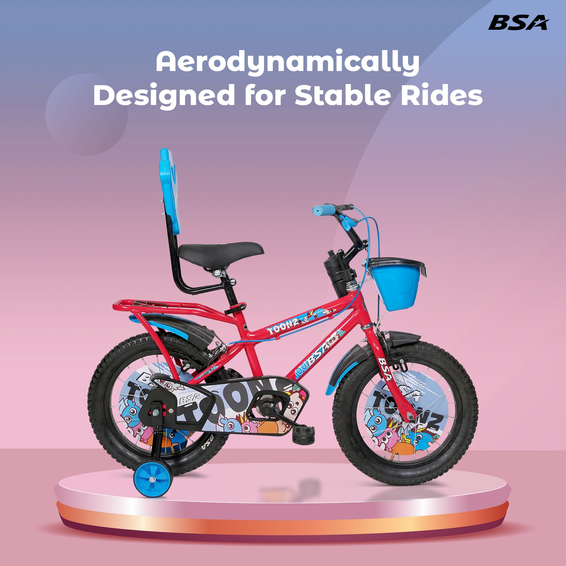 The BSA Toonz Kids Cycle is the ultimate choice for young riders, combining comfort, safety, and fun. Designed with bright, playful colors and a kid-friendly frame, this bike offers a delightful ride for little adventurers. The included back support ensures added comfort and safety, giving parents peace of mind while their children ride. Equipped with sturdy training wheels, the BSA Toonz helps build confidence and balance, making it perfect for beginners. Whether it's their first ride or they're improving their skills, the BSA Toonz provides a smooth, stable, and enjoyable cycling experience for every young rider. Let your child explore the outdoors in style with this reliable, fun-filled cycle!