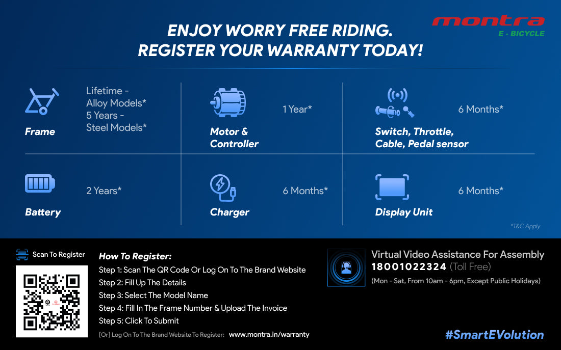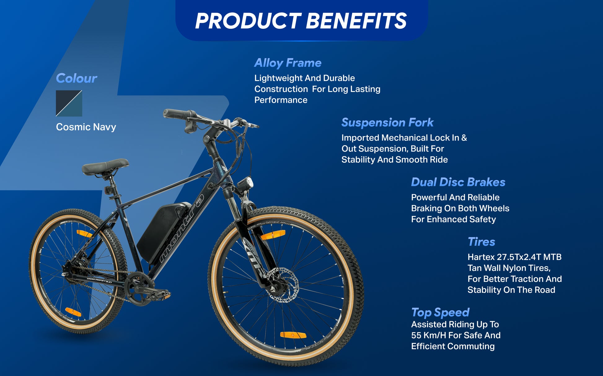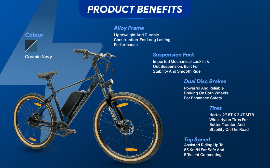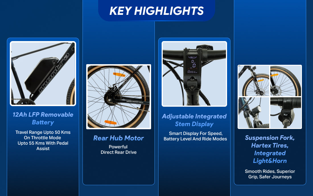 Range : Upto 50kms on Throttle Mode & 55kms on Pedal Assist