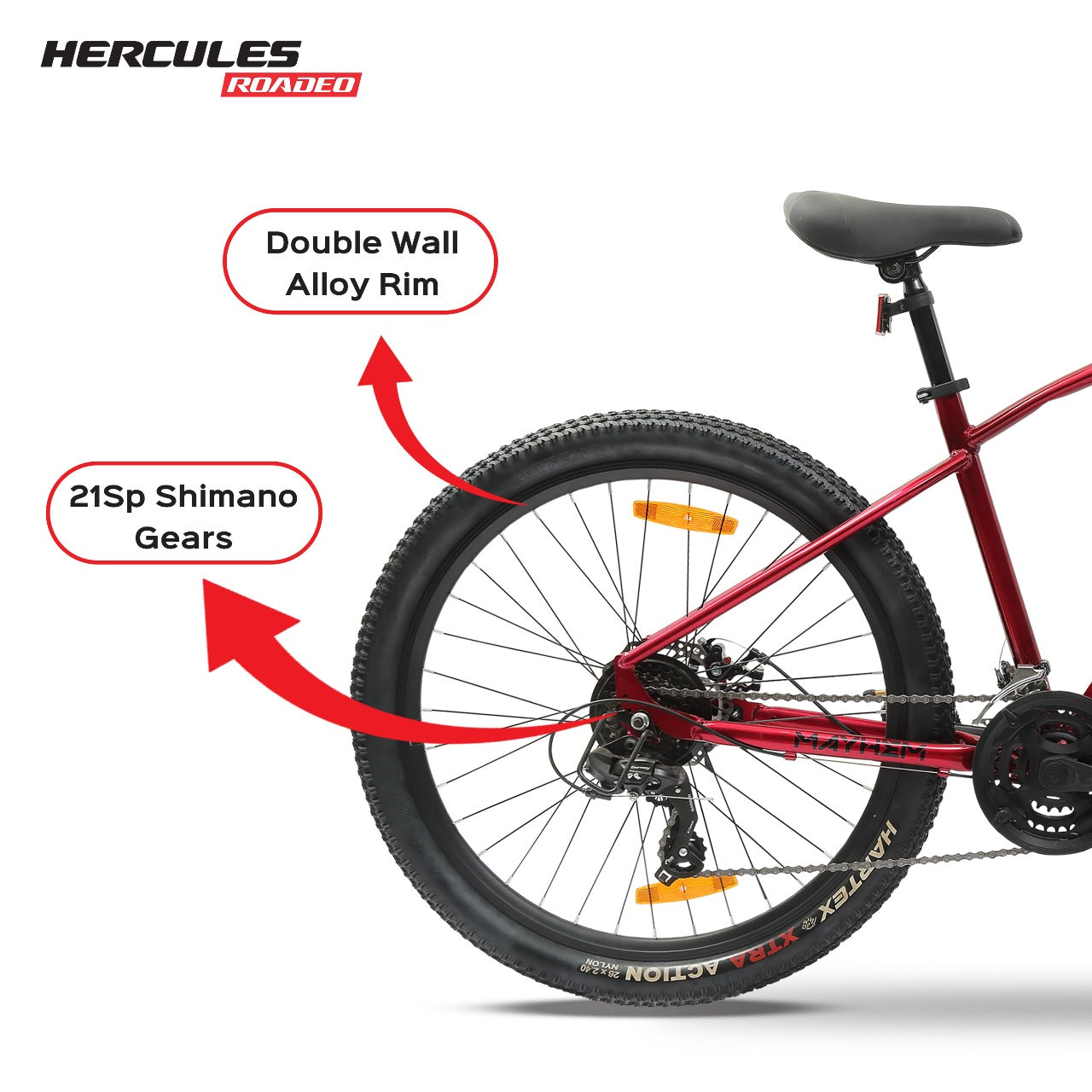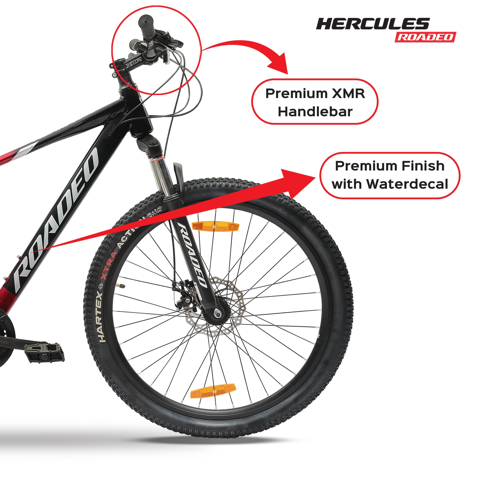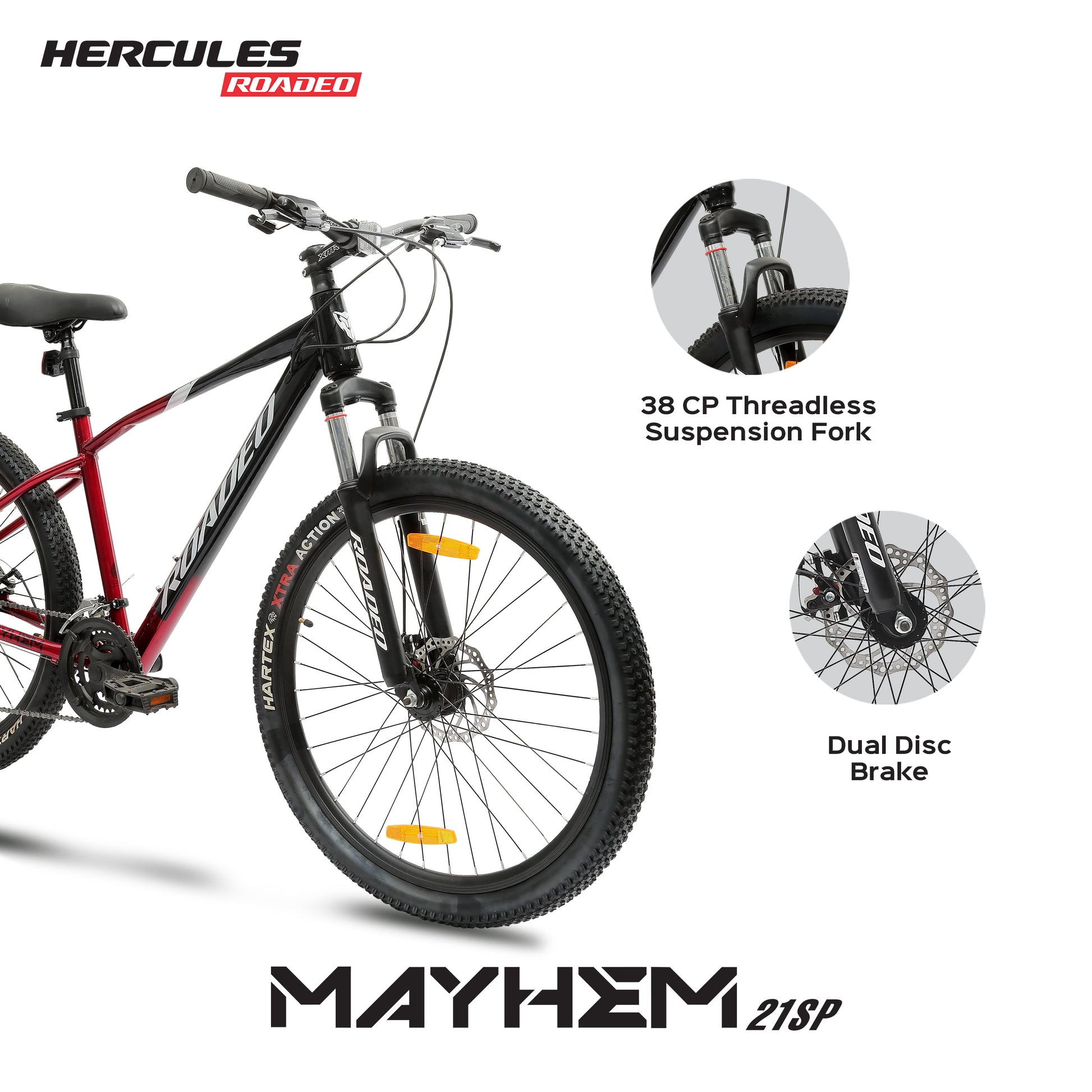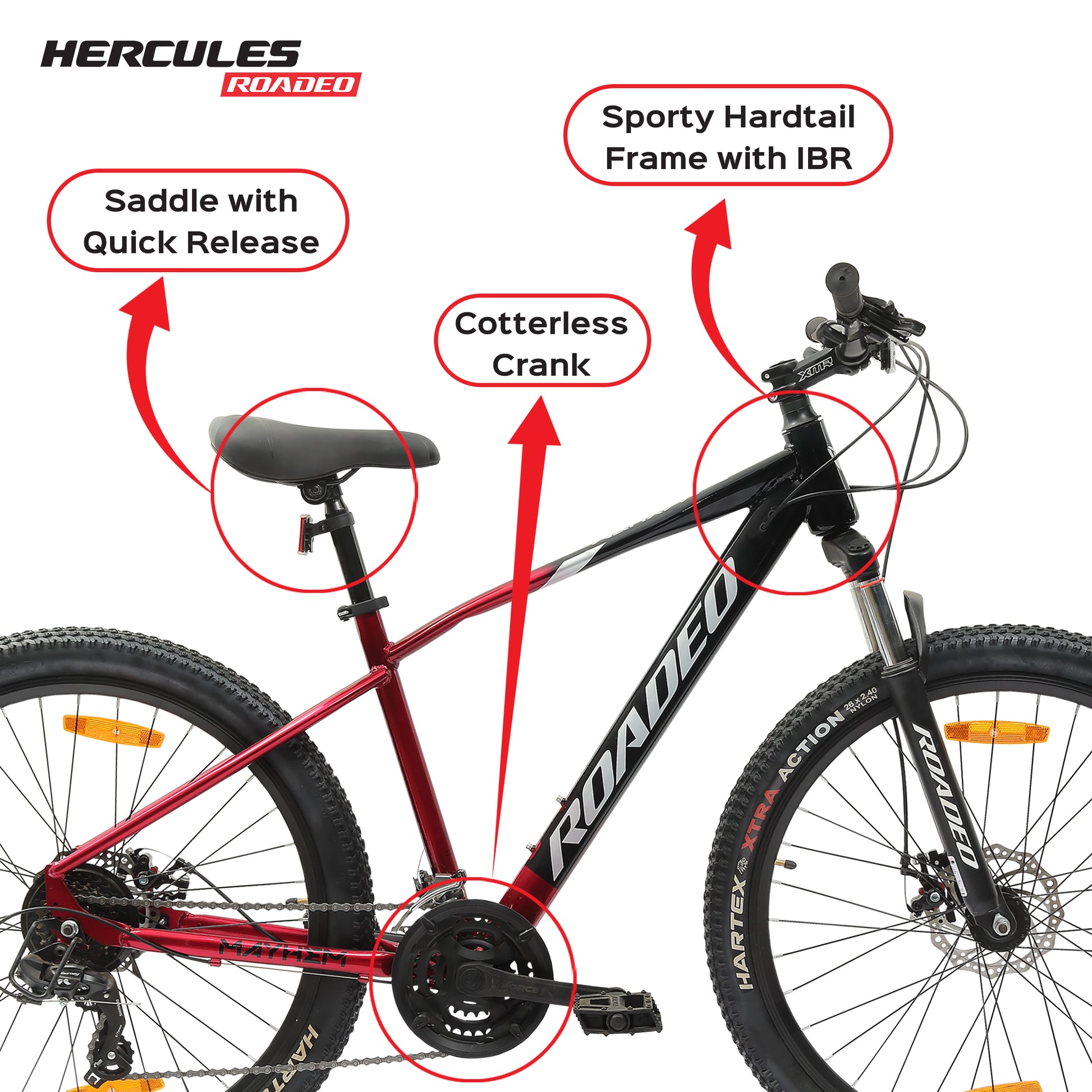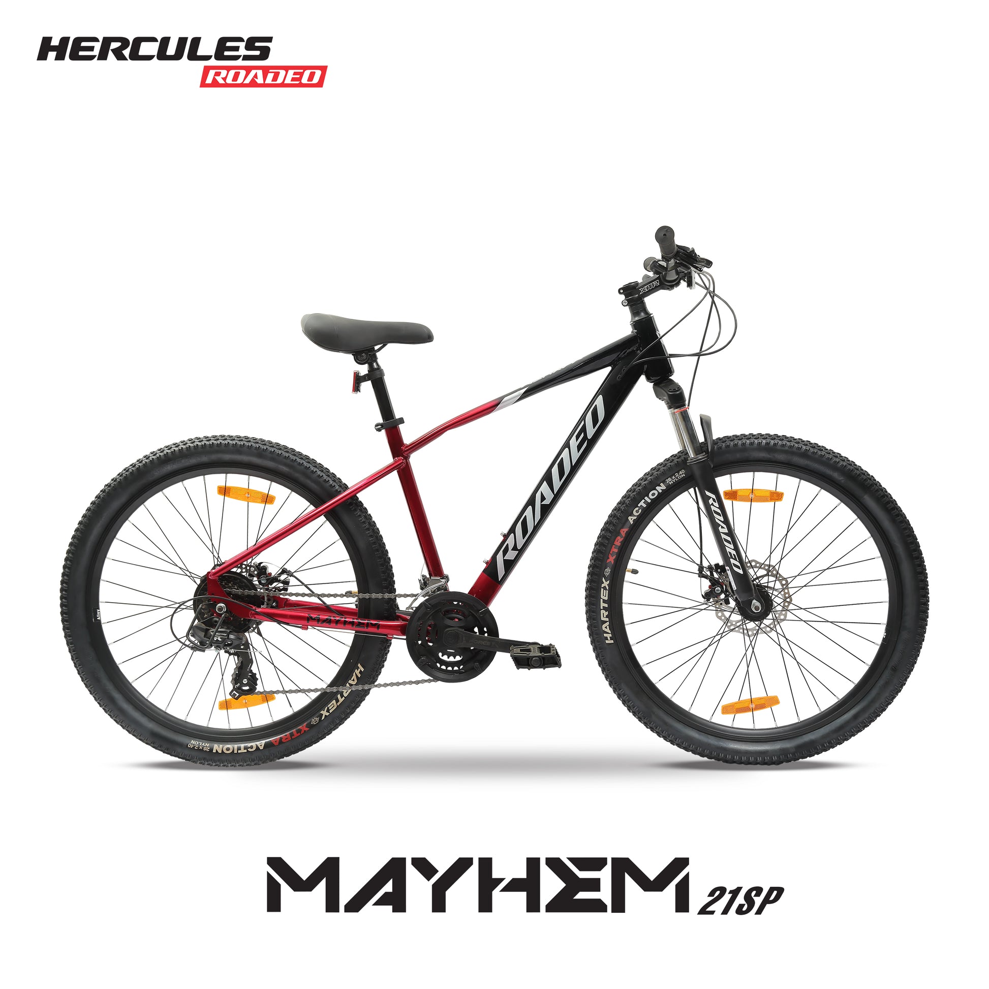 Unleash your wildest adventure with the Hercules Roadeo Mayhem! This bike features a sporty hardtail frame and a premium XMR MTB handlebar, ensuring a thrilling yet comfortable ride. Experience smooth gear changes with its 21-speed Shimano Tourney gears, and rely on the Dual Disc Brakes for confident stopping power. The Roadeo Mayhem boasts a multicut ultra-premium paint finish for a lasting sheen and eye-catching waterdecal stickering. Comfort is key with its soft PU Sporty Saddle with Quick Release.