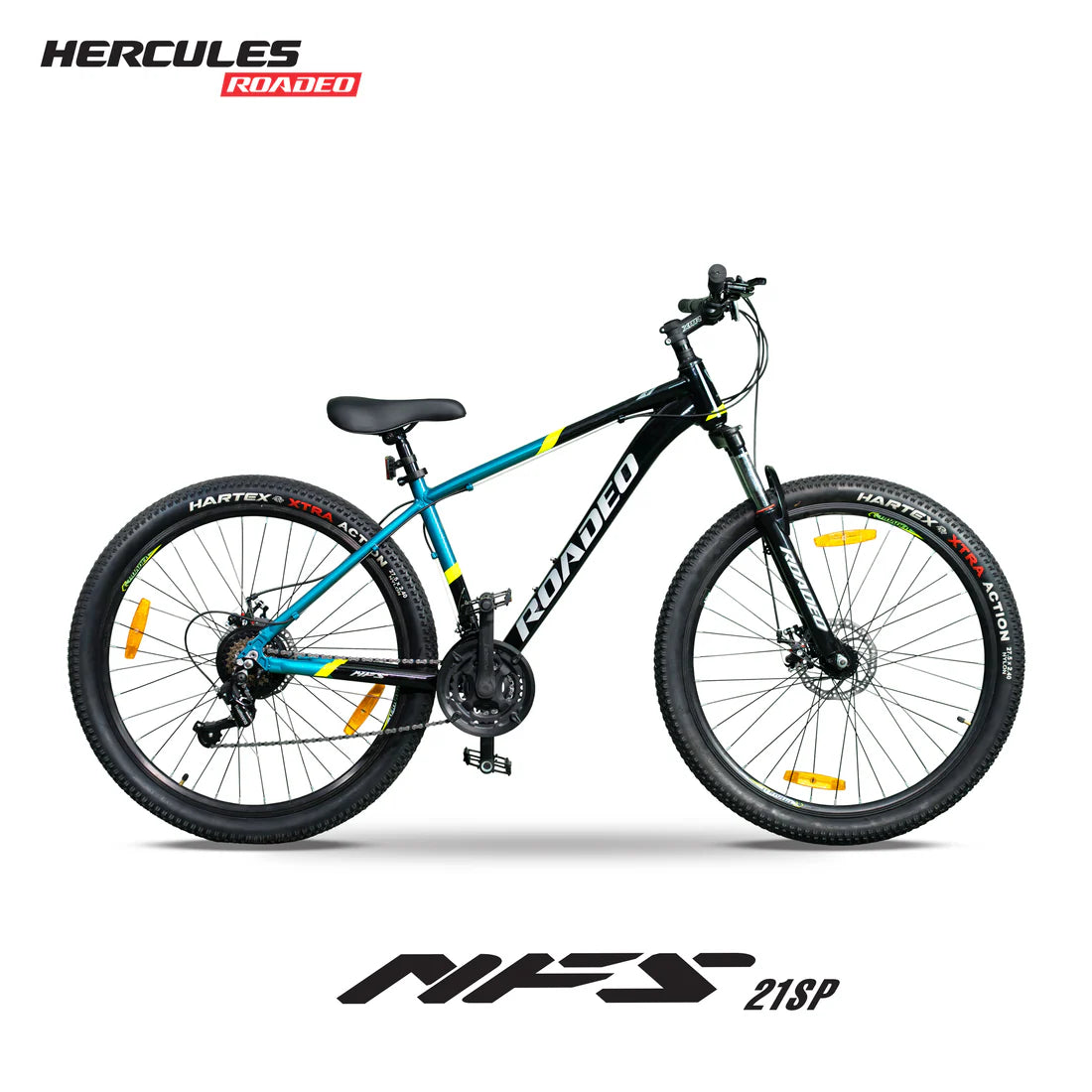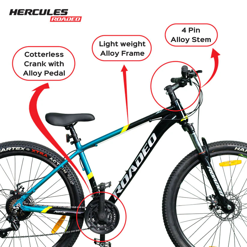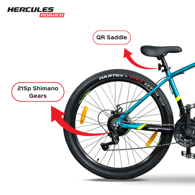 Your Need For Speed starts here with the Hercules Roadeo NFS, a bike designed for both durability and seamless performance. It features a lightweight Alloy Frame, Alloy Pedal, and a versatile Lock-in/Lock-out suspension. Enjoy smooth rides with its 21-speed Shimano gears. Experience comfort on the longest rides with a comfortable PU saddle with Quick Release. The Roadeo NFS stands out with its Premium liquid/multicut paint finish and eye-catching waterdecal stickering.
